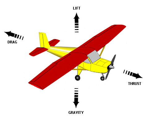 In a much simpler way imagine that the fan attached to the front of the plane( The above image) generates power and pushes the airplane in a forward motion. The 3 types of wings that you see help the airplane fly in the air. Now if the airplane has too much weight the result is that it won't be able to fly. Drag happens when the aircraft is pulled back resulting in slower speed.